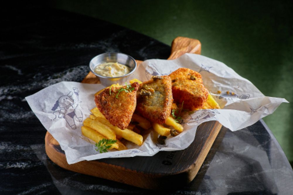 Филе дорадо в панировке из сухарей панко обжаривается во фритюре. Подается с картофелем фри и соусом Ремулад. Украшается консервированными каперсами фри.