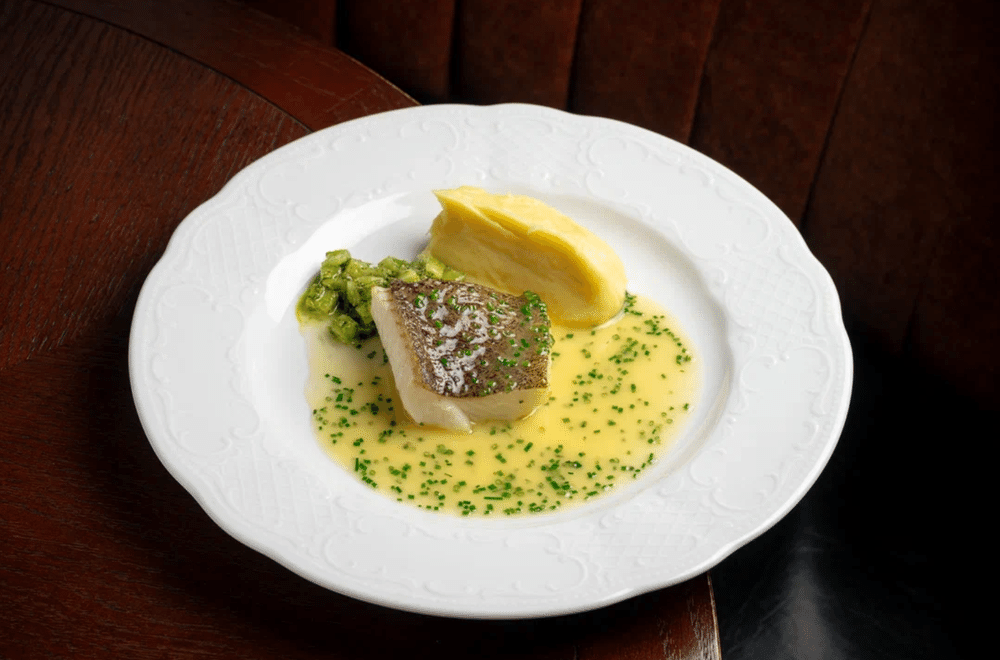 Филе палтус, картофельное пюре, лук-шнитт, cоус берблан