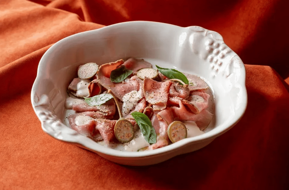 Слайсы вителло поливаются соусом тоннато, украшаются каперсами, листьями базилика, зеленым маслом и черным перцем