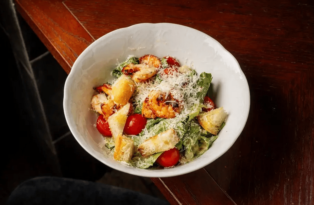 Хрустящие листья салата ромейн, томаты черри, нежные креветки, заправка на основе анчоусов, цитрусов и сыра Пармезан. Завершается хрустящими гренками из хлеба тартин и цедрой лайма.