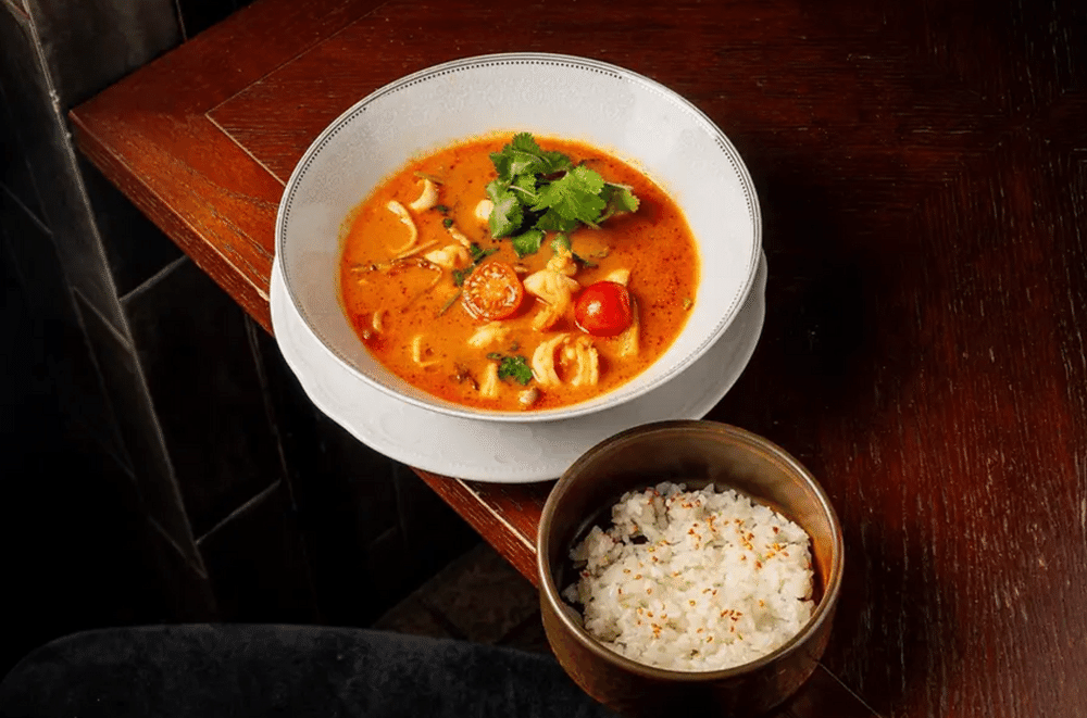 Пикантный бульон том ям с добавлением вешенок, томатов черри, кальмаров лолиго и креветок. Украшается кинзой и долькой лайма. Подается с рисом.
