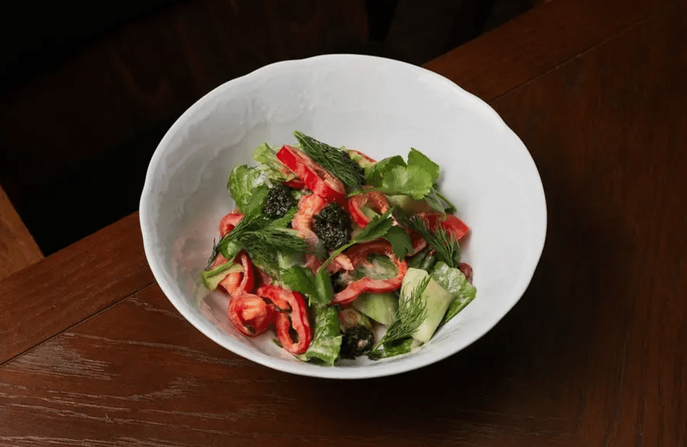Томаты свежие, огурцы свежие, перец болгарский свежий, салатный микс (салат Лолло роса, шпинат свежий, салат Радичио, салат Мангольд свежие, салат Руккола свежий), горошек лопатка бланшированный, лук красный свежий, зелень свежая, кинза свежая, семена подсолнечника, соль, специи