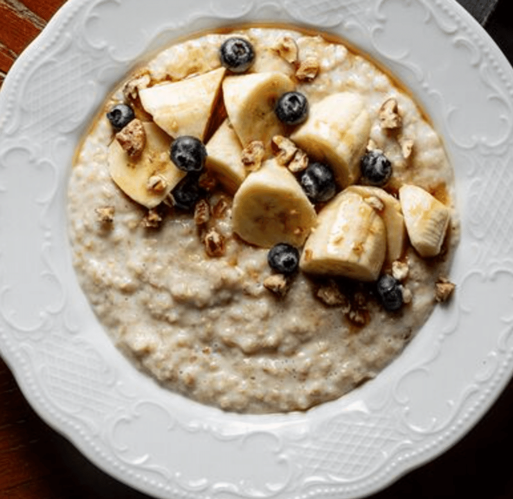 Нежная овсяная каша на молоке с кусочками сладкого банана, дополненная орехами пекан и голубикой, поливается ароматным кленовым сиропом
