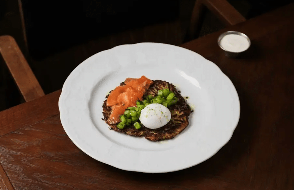 Хрустящий картофельный драник, приготовленный из ароматного замеса, подаётся с ломтиками слабосолёного лосося. Дополняется сметаной, зелёным маслом, огурцами, травяным пюре и отварным яйцом.