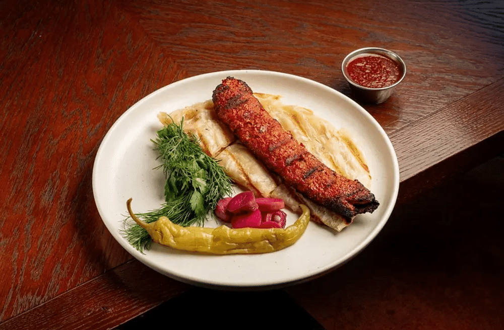 Кебаб из ягненка обжаривается на огне, подается с индийской слоеной лепешкой роти, запеченным томатом, зеленым маринованным перцем, сметанным соусом.