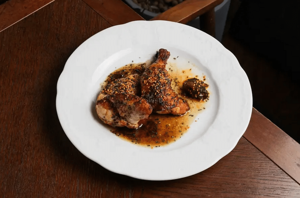 Нежная половинка цыпленка обжаривается на огне. Поливается соусом из трюфеля. Подается с битыми огурцами и кунжутом кимчи.