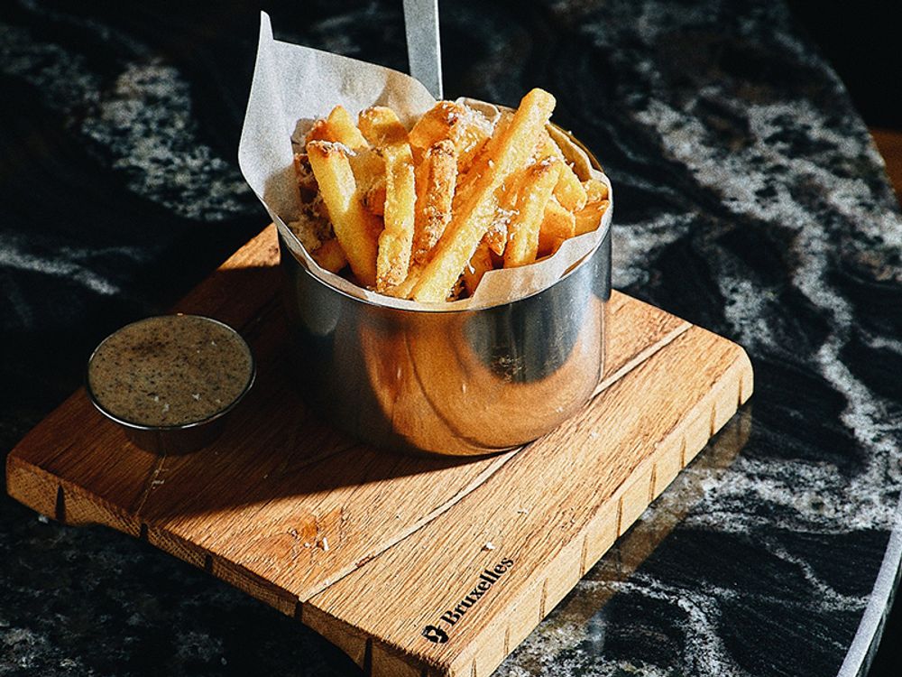 Обжаренные во фритюре ломтики картофеля перед подачей смешиваются с трюфельным маслом и тертым пармезаном. Подаются с трюфельным соусом