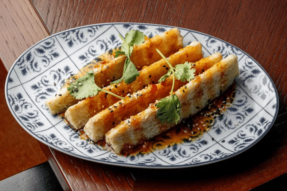 Баклажаны, панированные в крахмале и муке, обжариваются во фритюре. Подаются с имбирно-чесночным соусом (соус сладкий чили, соус Унаги, масло оливковое, кунжутное масло, имбирь свежий, чеснок свежий, сок лайма), украшается кунжутом кимчи и веточкой кинзы