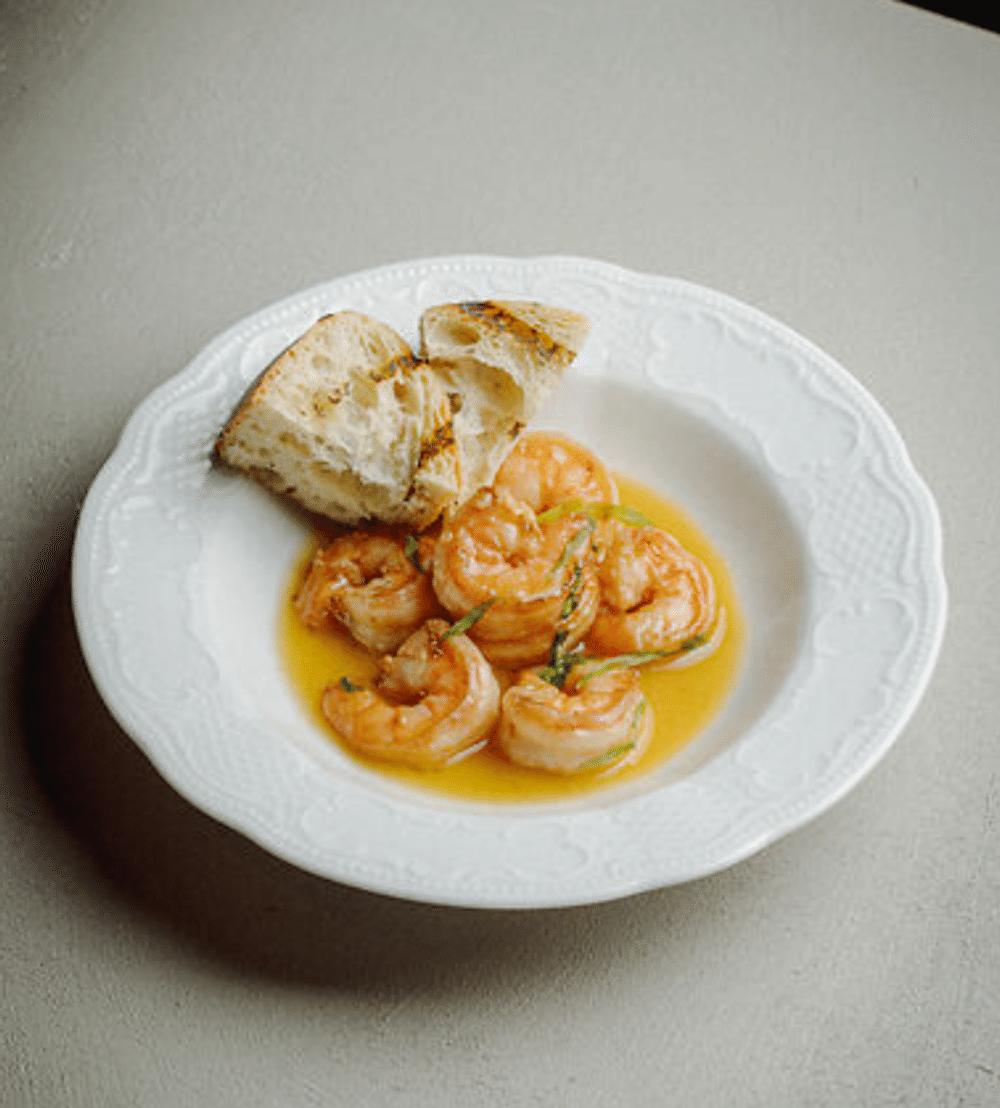 Креветки тигровые, сливочное масло, чеснок, эстрагон, хлеб тартин