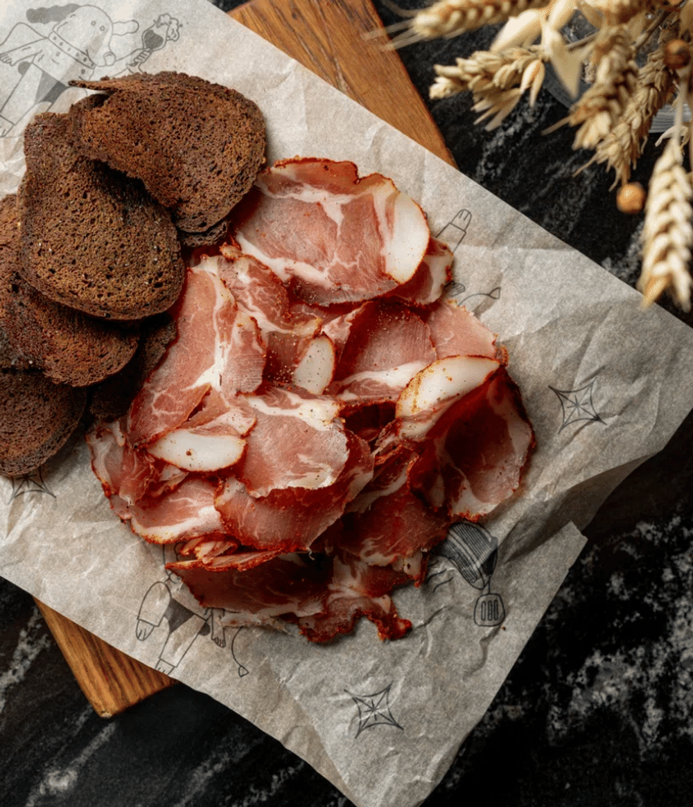Сыровяленая свиная шейка собственного производства, выдерживается 40 дней в камере сухого вызревания и подается с гренками из бородинского хлеба