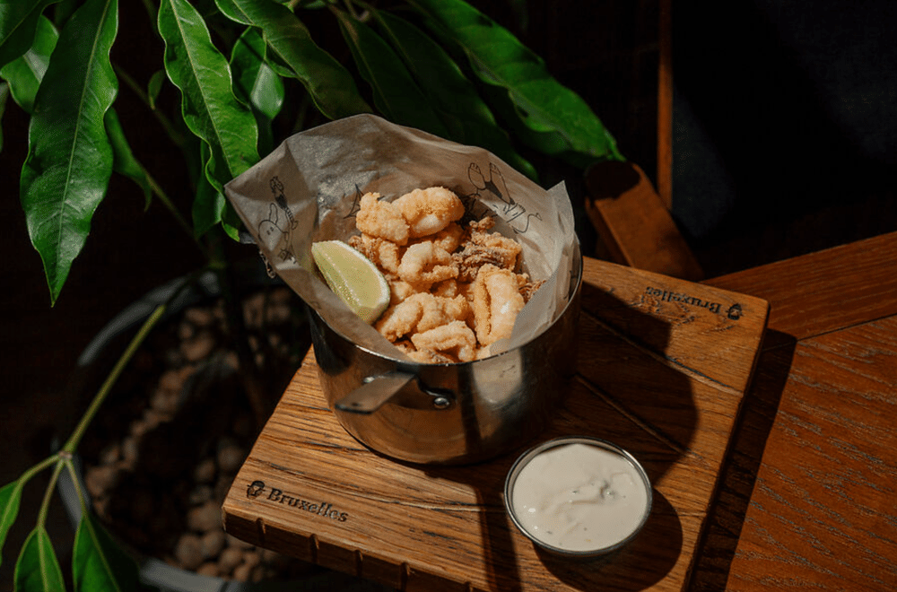 Кальмар, жаренный во фритюре , мука из твердых сортов пшеницы, лайм свежий, соус Айоли из печёного чеснока (майонез, сливки, крем из печёного чеснока)
