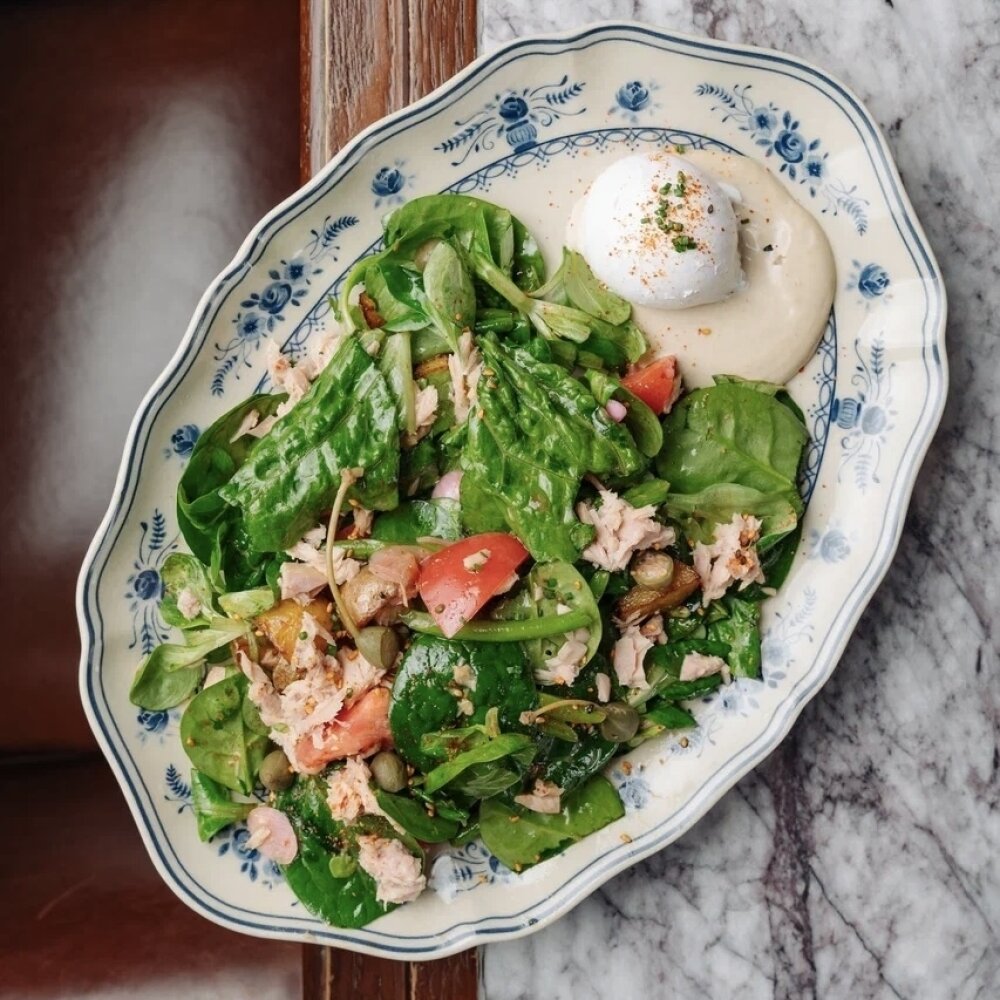 Тунец консервированный, салат ромейн, шпинат, картофель стоун, фасоль стручковая, томаты, лук маринованный, каперсы, яйцо куриное, соус тоннато (тунец, анчоусы, каперсы, масло оливковое, майонез), заправка (масло оливковое, масло чили, винный уксус, горчица, фреш лимона, цедра лимона, мёд, мисо паста, анчоусы, тимьян, базилик, печёный чеснок).