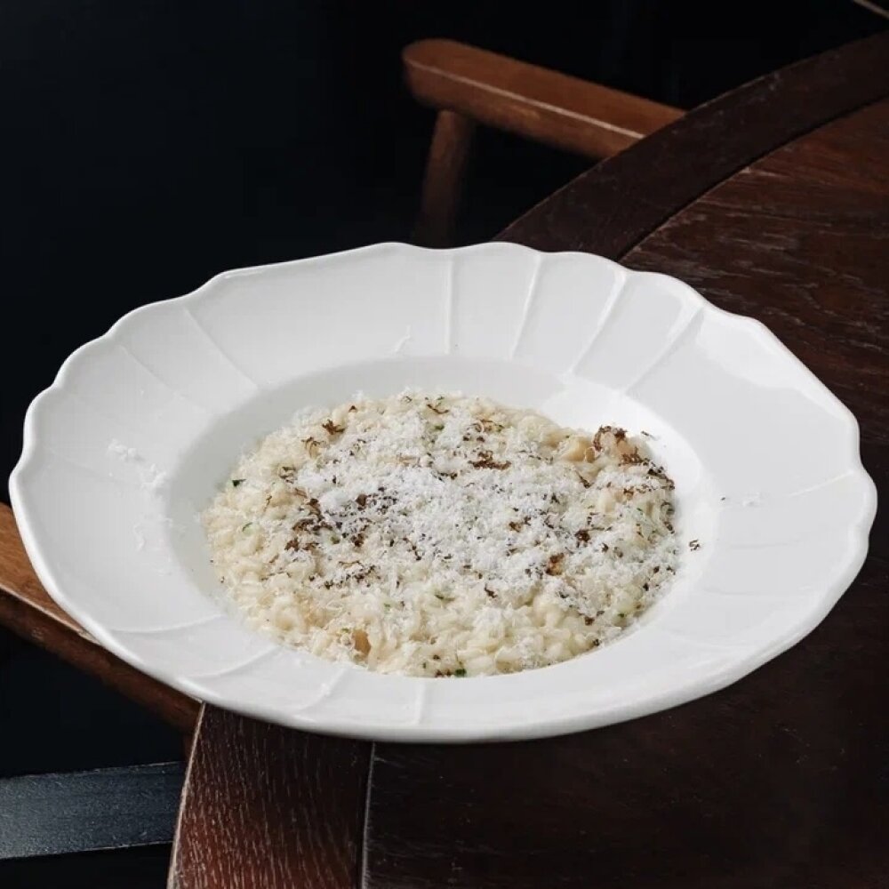 Рис карнароли, сливочное масло, пармезан, лук-шалот, жаренные белые грибы, трюфельное масло, пармезан, свежий чёрный трюфель.
