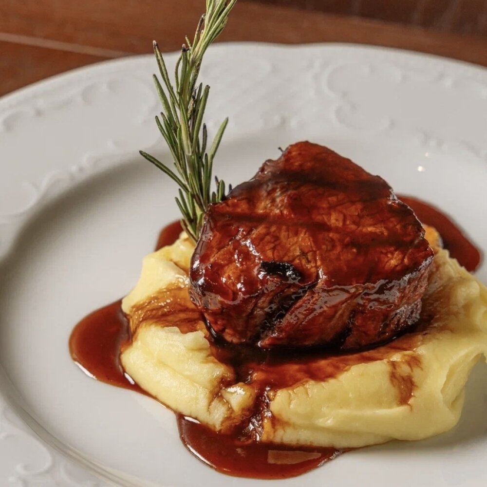 Стейк из говяжьей вырезки подается с картофельным пюре и соусом на основе пива Бургунь де Фландерс. Украшается веточкой розмарина