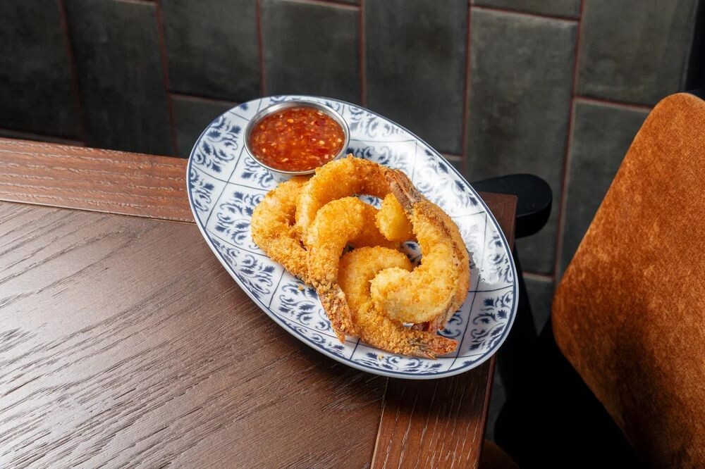 Тигровые креветки в хрустящей панировке с имбирным соусом на основе свит-чили