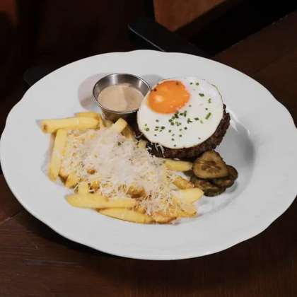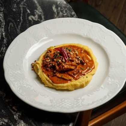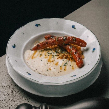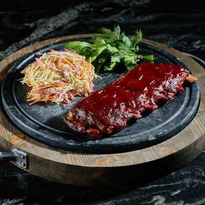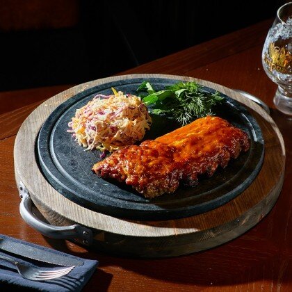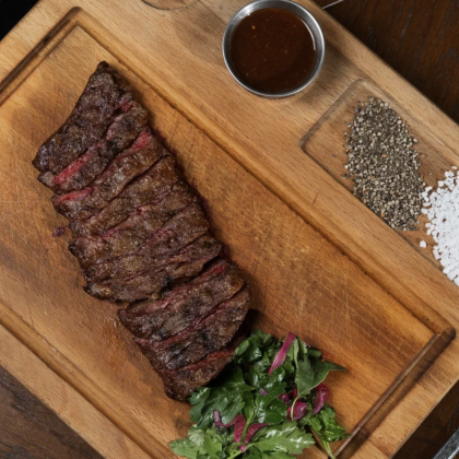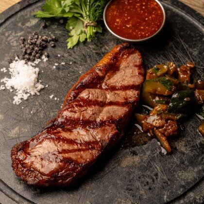 Толстый край говядины. Сервируем с cоусом Нью-Йорк. Самый сочный и мраморный стейк из тех, что у нас представлены.
